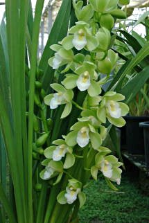 鮮やかなグリーンの花弁。白地に、ごく淡いピンクのリップは