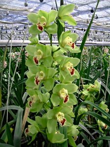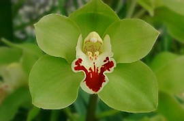 鮮やかなグリーンの花弁に赤のV字リップ。